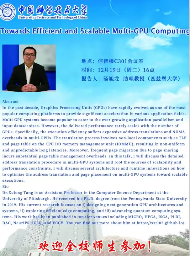 - 学术报告 Towards Efficient and Scalable Multi-GPU Computing By Xulong Tang :学术界的研究一直都是个不断向前的,就像最早专注于单核的提升,之后又偏向于多核的提升。现在对于multi-device的研究。设计的思想其实从逻辑上感觉不复杂,分析现有机器架构下应用的时间占比,关键路径,拆分对象,然后塞buffer,塞cache剪枝关键路径来加速。但是这种工作又是科研发展路上的必经之路。